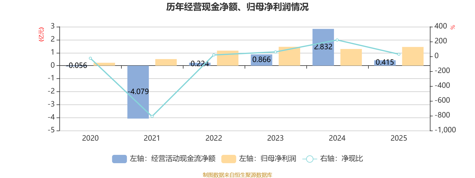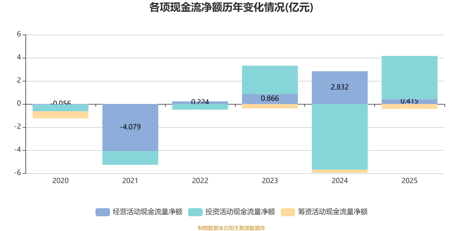 2025年,公司经营活动现金流净额为4150.93万元,同比下降85.34%;筹资活动现金流净额-4265.11万元,同比减少1621.66万元;投资活动现金流净额3.74亿元,上年同期为-5.69亿元。
