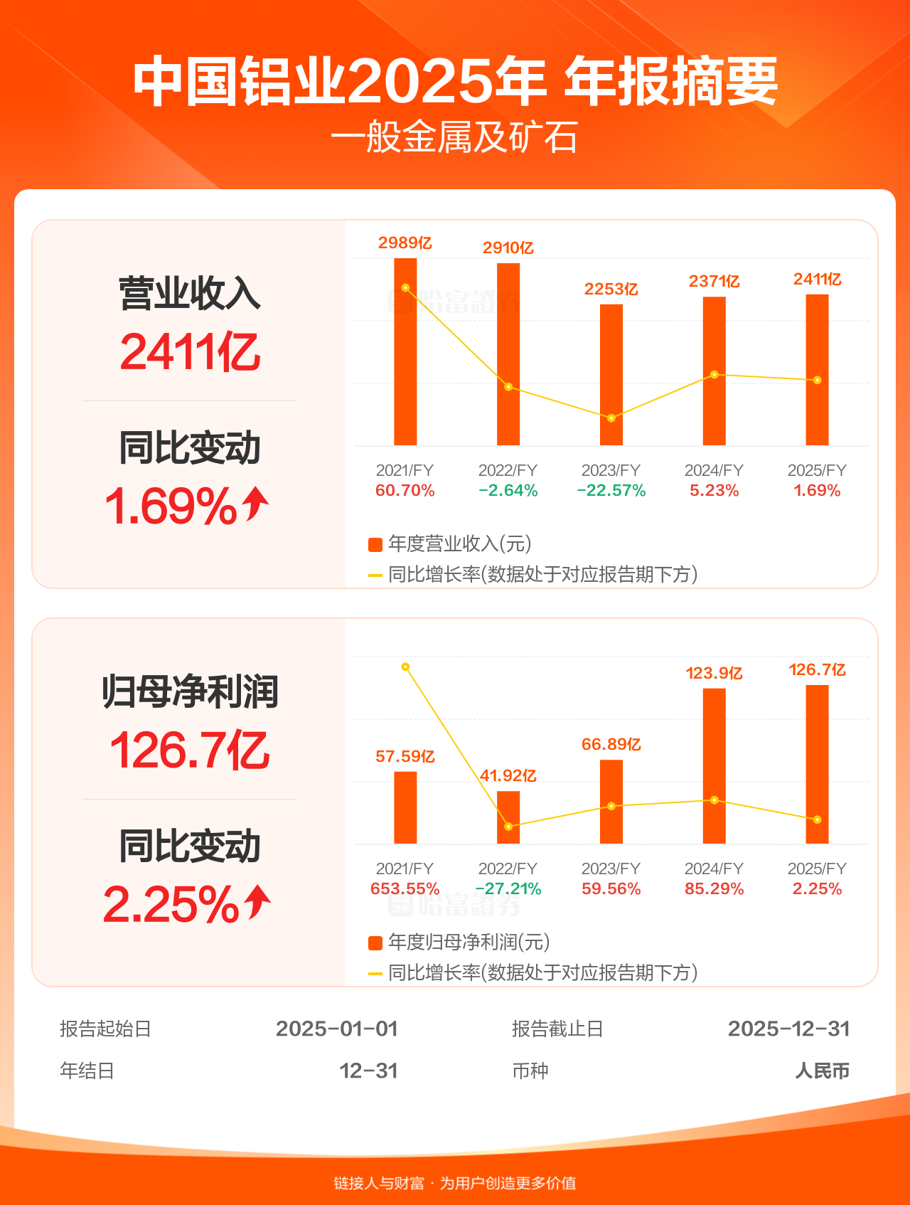 中国铝业3月27日发布年报业绩,截至2025年12月31日的12个月内,该公司营业收入2411.25亿人民币,同比增长1.69%;公司权益持有人应占溢利(归母净利润)126.74亿人民币,同比增长2.25%,低于机构一致预测的176.38亿人民币。
