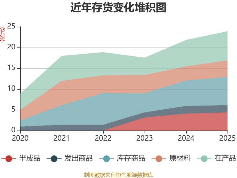 从存货变动来看,截至2025年末,公司存货账面价值为23.92亿元,占净资产的11.04%,较上年末增加2.11亿元。其中,存货跌价准备为6979.49万元,计提比例为2.84%。