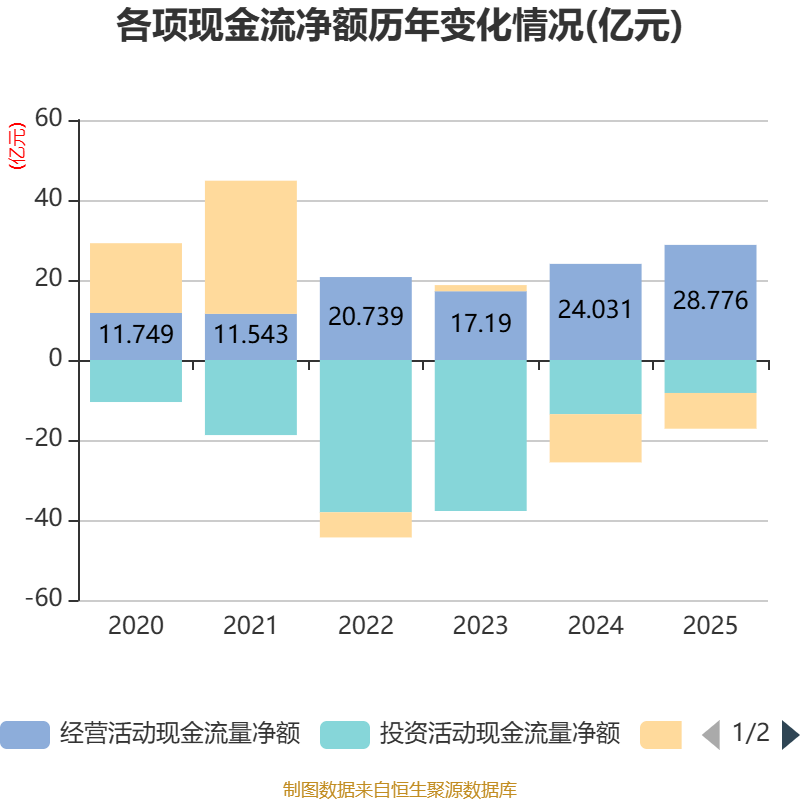 截至2025年,公司经营活动现金流净额为28.78亿元,同比增长19.74%;筹资活动现金流净额-8.94亿元,同比增加3.12亿元;投资活动现金流净额-8.24亿元,上年同期为-13.54亿元。