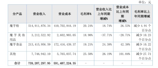 “营收利润背离”的根源在于毛利率的全线失守——魔芋粉、魔芋食品、魔芋美妆用品三大板块无一幸免,原料价格上涨直接侵蚀了利润空间。