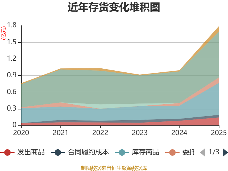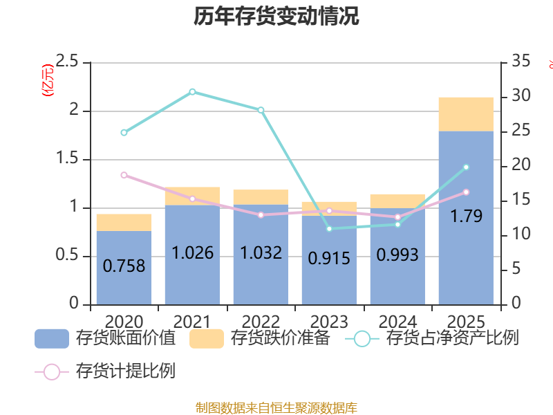 从存货变动来看,截至2025年末,公司存货账面价值为1.79亿元,占净资产的19.83%,较上年末增加7969.88万元。其中,存货跌价准备为3466.36万元,计提比例为16.22%。