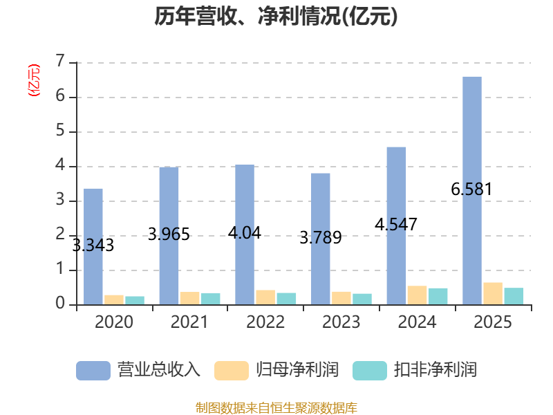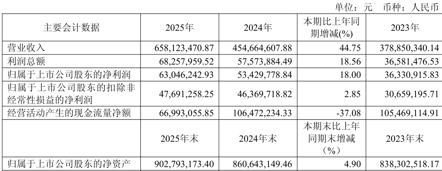 中证智能财讯中润光学(688307)3月28日披露2025年年度报告。2025年,公司实现营业总收入6.58亿元,同比增长44.75%;归母净利润6304.62万元,同比增长18.00%;扣非净利润4769.13万元,同比增长2.85%;经营活动产生的现金流量净额为6699.31万元,同比下降37.08%;报告期内,中润光学基本每股收益为0.71元,加权平均净资产收益率为7.16%。公司2025年度分配预案为:拟向全体股东每10股转4股,派现4元(含税)。