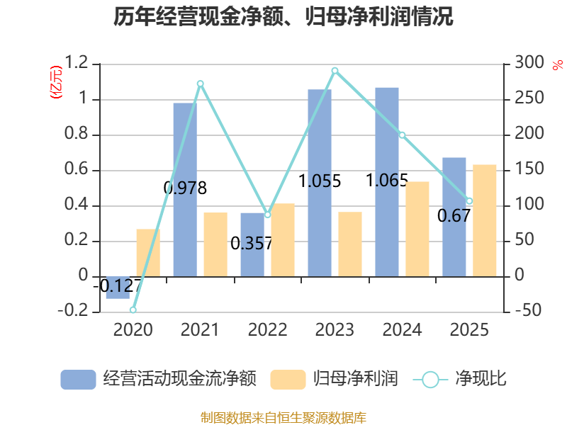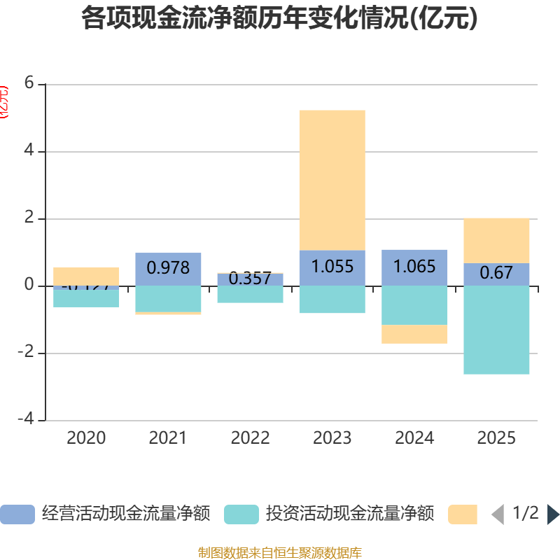 截至2025年,公司经营活动现金流净额为6699.31万元,同比下降37.08%;筹资活动现金流净额1.34亿元,同比增加1.89亿元;投资活动现金流净额-2.64亿元,上年同期为-1.17亿元。