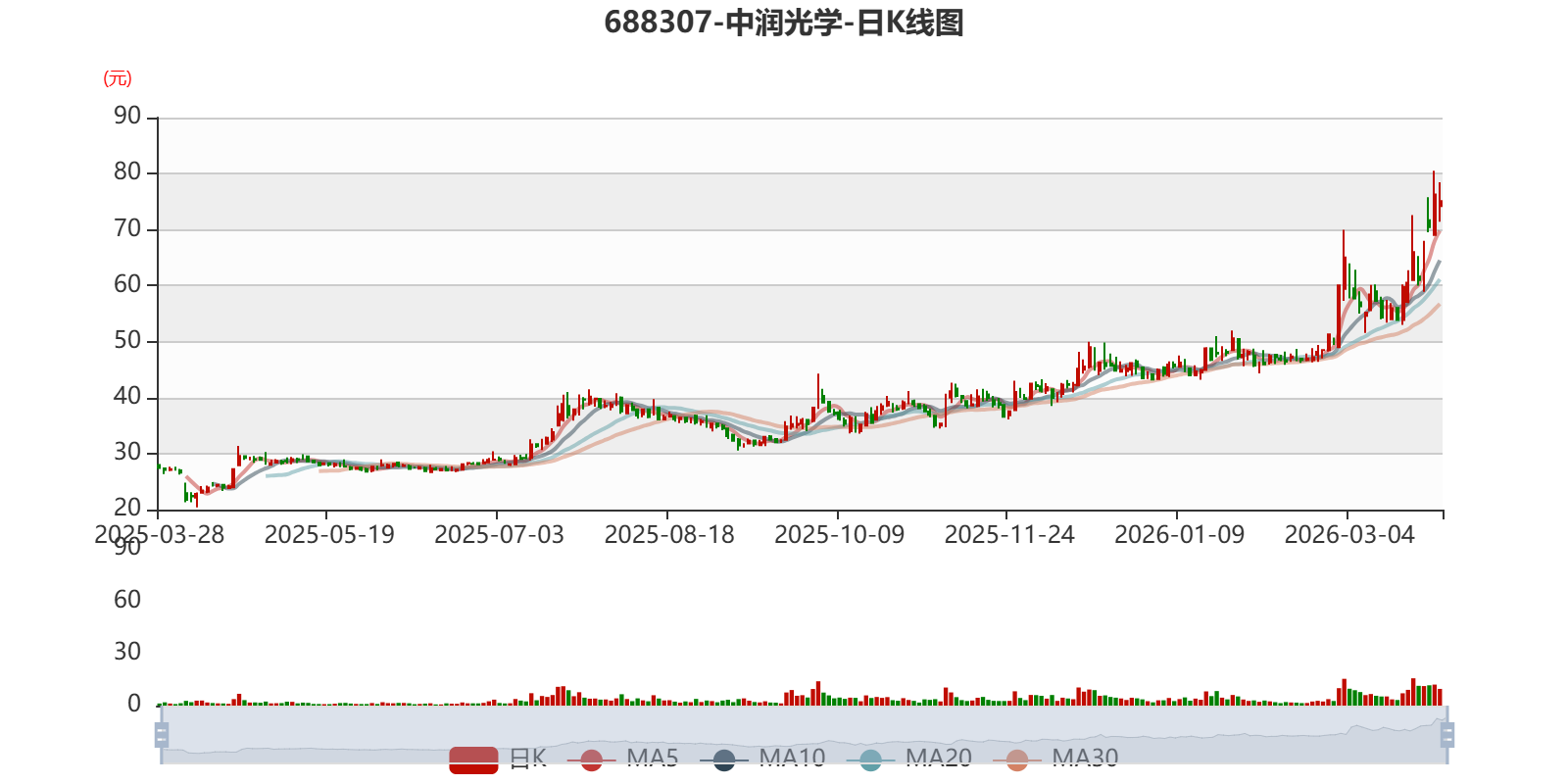 以3月27日收盘价计算,中润光学目前市盈率(TTM)约为105.75倍,市净率(LF)约7.38倍,市销率(TTM)约10.13倍。