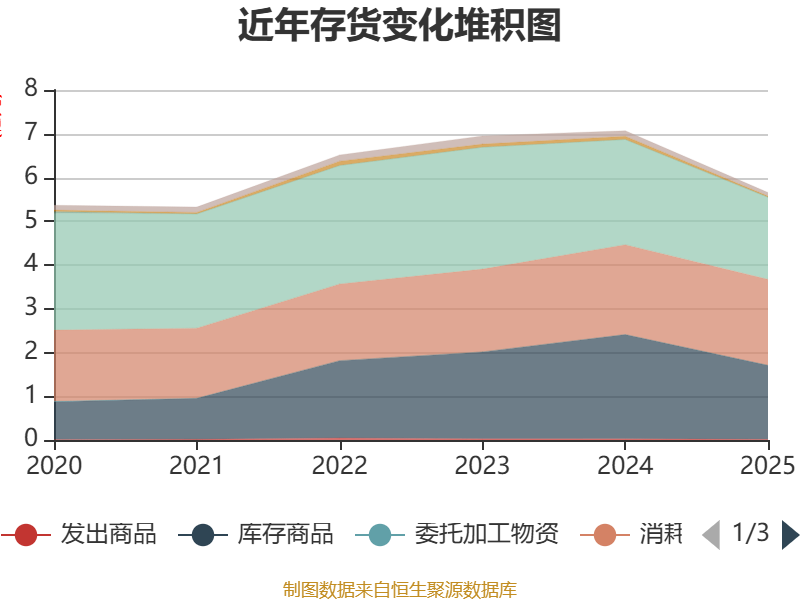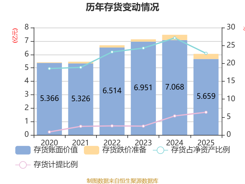 从存货变动来看,截至2025年末,公司存货账面价值为5.66亿元,占净资产的22.81%,较上年末减少1.41亿元。其中,存货跌价准备为3833.23万元,计提比例为6.34%。