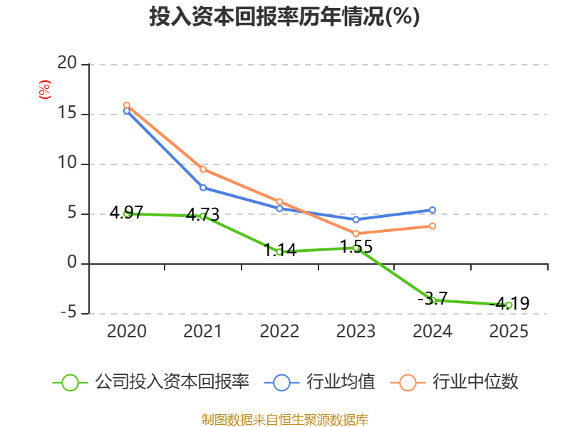 数据显示,2025年公司加权平均净资产收益率为-5.05%,较上年同期下降0.66个百分点。公司2025年投入资本回报率为-4.19%,较上年同期下降0.49个百分点。