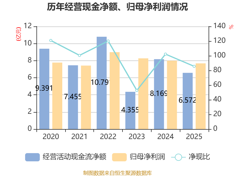 截至2025年,公司经营活动现金流净额为6.57亿元,同比下降19.55%;筹资活动现金流净额-4.86亿元,同比减少1.39亿元;投资活动现金流净额3.23亿元,上年同期为-10.96亿元。