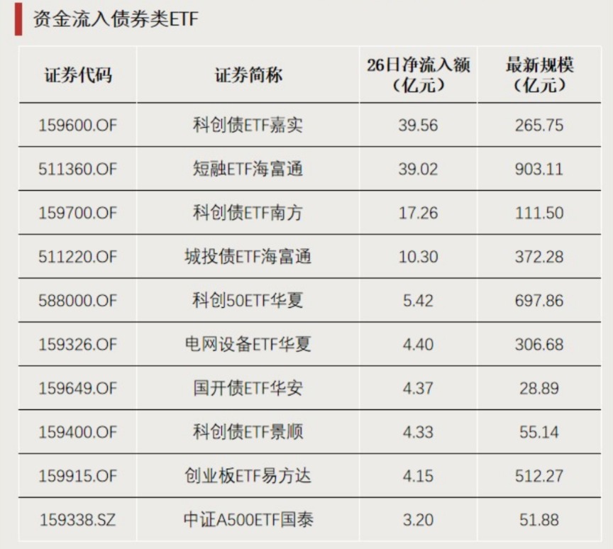 3月26日,ETF市场资金流向明显分化,债券型ETF获资金集中流入,部分宽基ETF则持续遭遇资金流出。当日债券型ETF合计净流入超120亿元。其中,科创债ETF嘉实净流入额为39.56亿元,短融ETF海富通净流入额为39.02亿元。