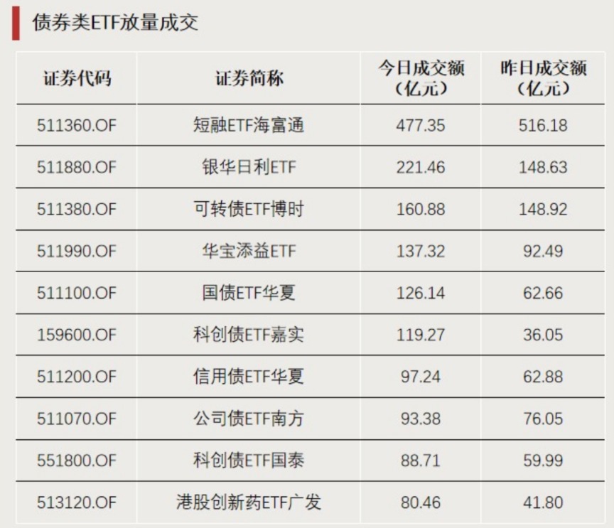 债券类ETF今日交投显著升温,成交量较昨日大幅提升。国债ETF华夏今日成交额达126.14亿元,较昨日的62.66亿元明显放量;科创债ETF嘉实今日成交额为119.27亿元,相比昨日大幅放量。