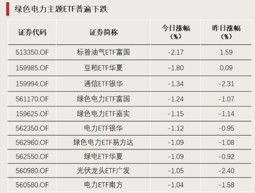 绿色电力、电力主题ETF普跌,绿色电力ETF富国下跌1.24%,绿色电力ETF嘉实下跌1.15%。此外,多只光伏ETF产品走低。