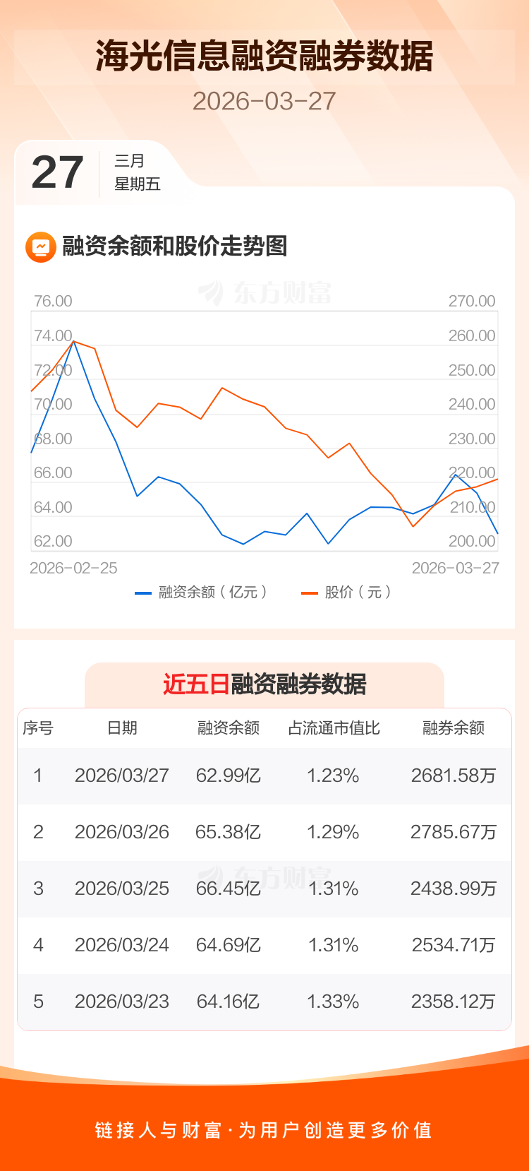 交易所最新数据显示,海光信息于2026年3月27日获融资买入1.84亿元,融资偿还4.23亿元,当日融资净偿还2.39亿元。目前,该股融资余额62.99亿,占流通市值比例为1.23%。