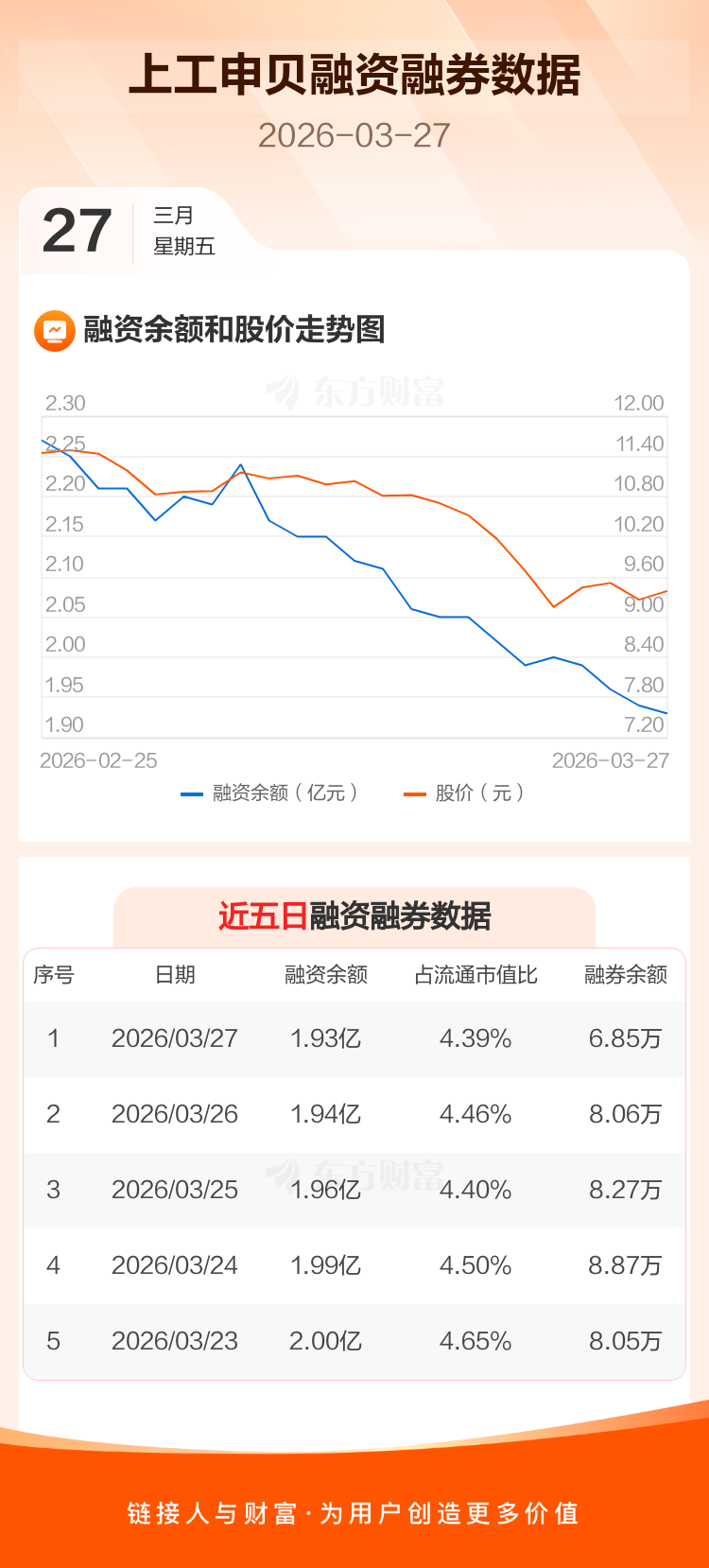 交易所最新数据显示,上工申贝于2026年3月27日获融资买入299.52万元,融资偿还331.38万元,当日融资净偿还31.85万元。目前,该股融资余额1.93亿,占流通市值比例为4.39%。