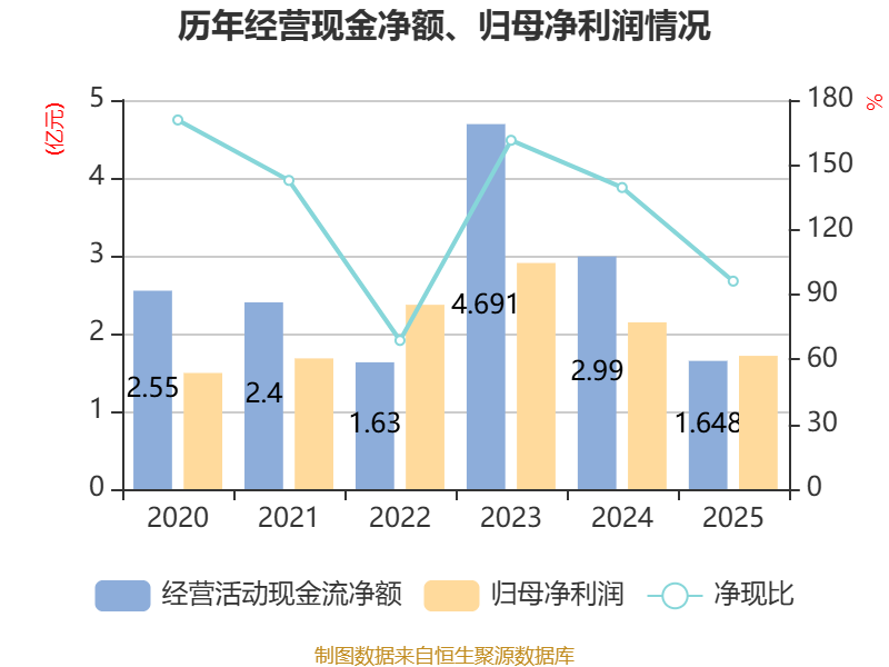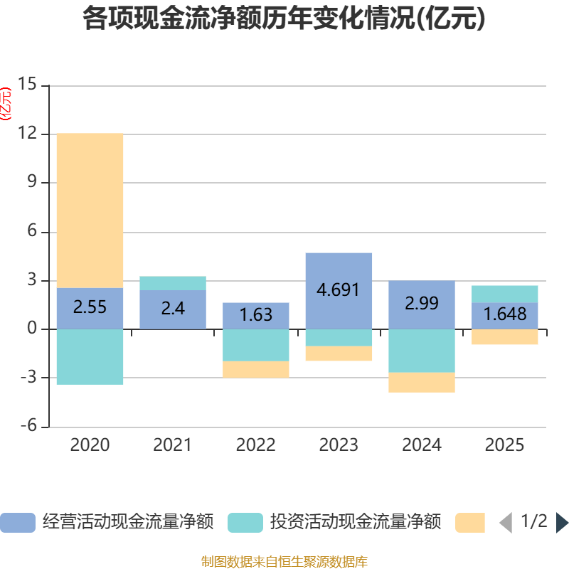 截至2025年,公司经营活动现金流净额为1.65亿元,同比下降44.89%;筹资活动现金流净额-9401.3万元,同比增加2887.23万元;投资活动现金流净额1.04亿元,上年同期为-2.67亿元。