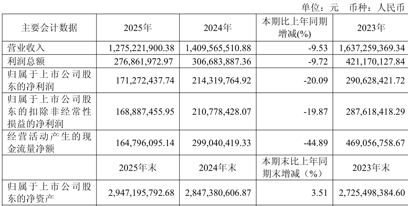 中证智能财讯铁科轨道(688569)3月28日披露2025年年度报告。2025年,公司实现营业总收入12.75亿元,同比下降9.53%;归母净利润1.71亿元,同比下降20.09%;扣非净利润1.69亿元,同比下降19.87%;经营活动产生的现金流量净额为1.65亿元,同比下降44.89%;报告期内,铁科轨道基本每股收益为0.81元,加权平均净资产收益率为5.92%。公司2025年度分配预案为:拟向全体股东每10股派现2.7元(含税)。
