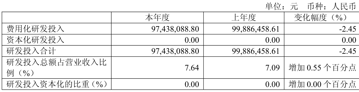 2025年全年,公司研发投入金额为9743.81万元,同比下降2.45%;研发投入占营业收入比例为7.64%,相比上年同期上升0.55个百分点。此外,公司全年研发投入资本化率为0%。