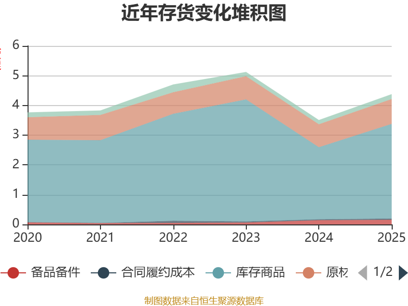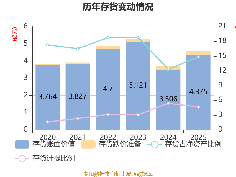 从存货变动来看,截至2025年末,公司存货账面价值为4.38亿元,占净资产的14.85%,较上年末增加8690.03万元。其中,存货跌价准备为2129.12万元,计提比例为4.64%。