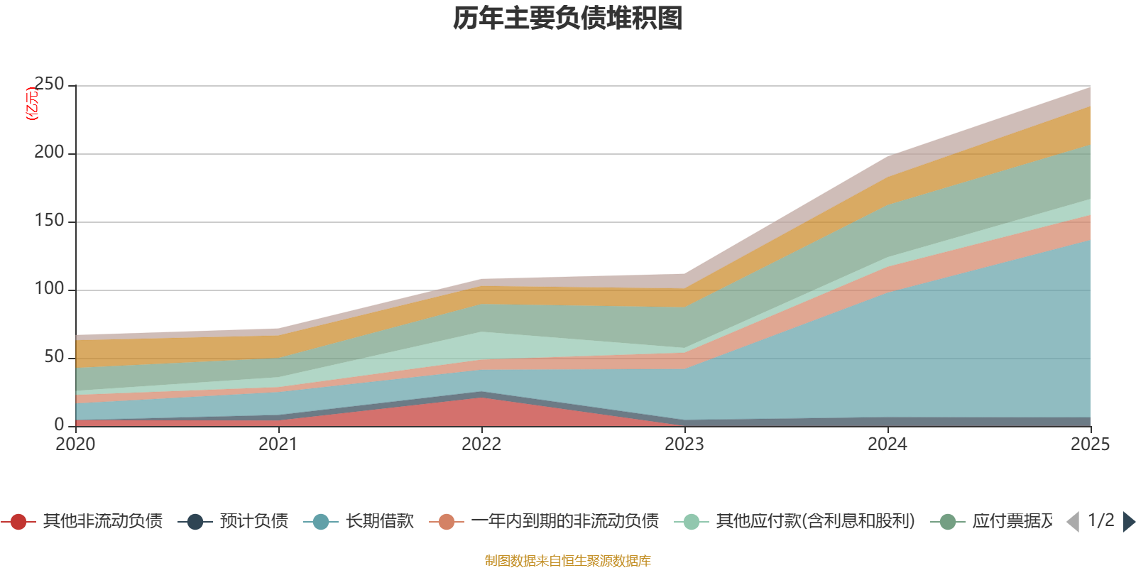 负债重大变化方面,截至2025年末,公司长期借款较上年末增加42.7%,占公司总资产比重上升6.26个百分点;短期借款较上年末增加37.61%,占公司总资产比重上升1.2个百分点;其他应付款(含利息和股利)较上年末增加65.09%,占公司总资产比重上升0.8个百分点;长期应付款合计较上年末减少90.03%,占公司总资产比重下降0.61个百分点。