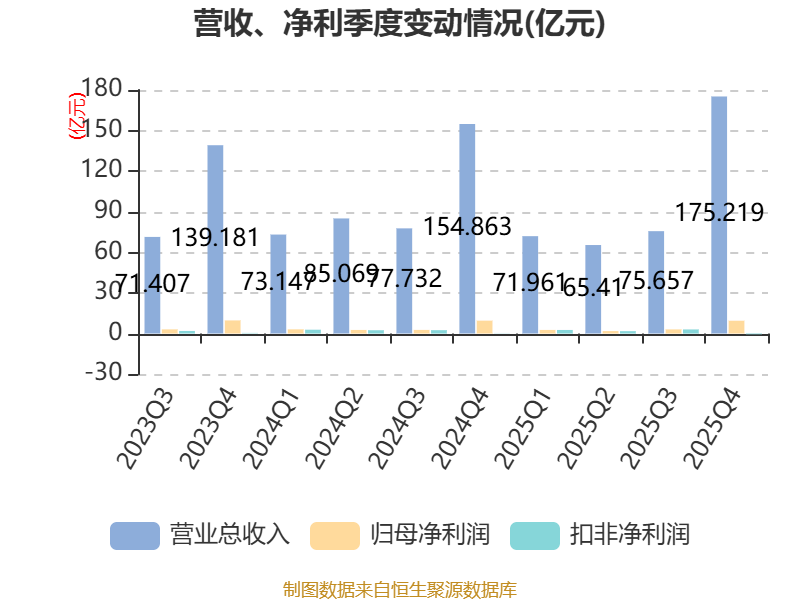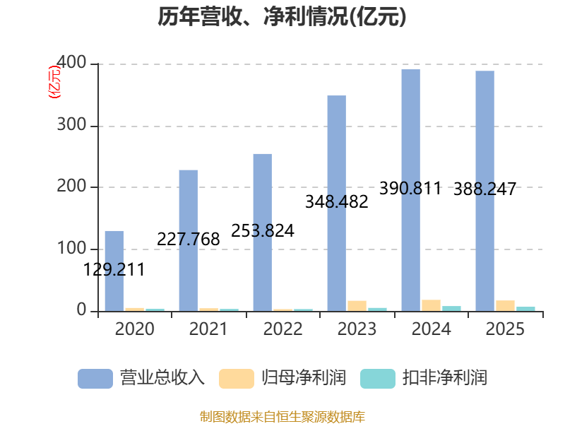 中证智能财讯淮河能源(600575)3月28日披露2025年年度报告。2025年,公司实现营业总收入388.25亿元,同比下降0.66%;归母净利润16.98亿元,同比下降5.33%;扣非净利润6.85亿元,同比下降13.05%;经营活动产生的现金流量净额为37.57亿元,同比下降13.07%;报告期内,淮河能源基本每股收益为0.24元,加权平均净资产收益率为7.43%。公司2025年度分配预案为:拟向全体股东每10股派现1.9元(含税)。