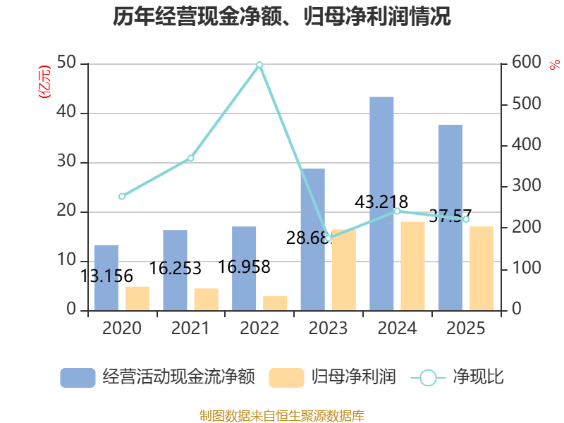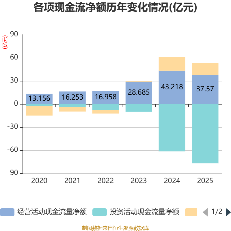 截至2025年,公司经营活动现金流净额为37.57亿元,同比下降13.07%;筹资活动现金流净额15.44亿元,同比减少2.38亿元;投资活动现金流净额-77.05亿元,上年同期为-61.61亿元。
