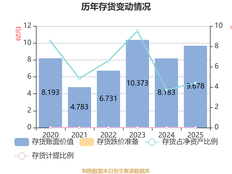 从存货变动来看,截至2025年末,公司存货账面价值为9.68亿元,占净资产的4.4%,较上年末增加1.49亿元。公司本期没有计提存货跌价准备。