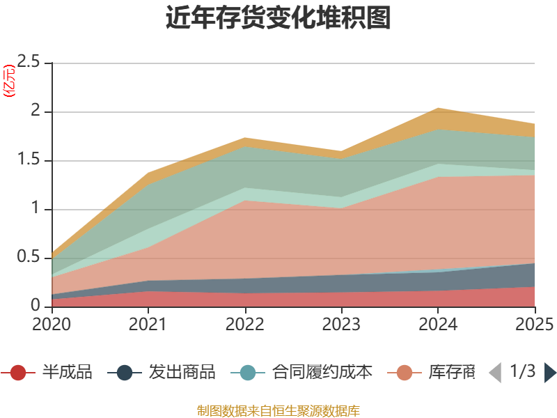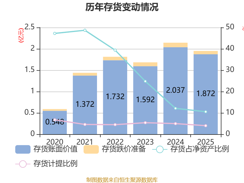 从存货变动来看,截至2025年末,公司存货账面价值为1.87亿元,占净资产的10.52,较上年末减少1649.77万元。其中,存货跌价准备为778.04万元,计提比例为3.99%。
