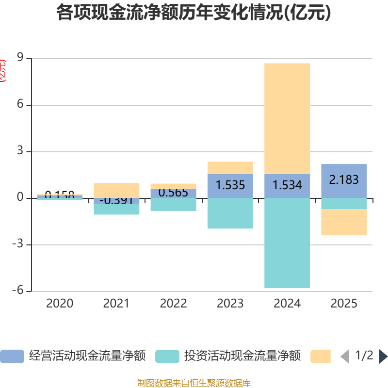 截至2025年,公司经营活动现金流净额为2.18亿元,同比增长42.29%;筹资活动现金流净额-1.69亿元,同比减少8.83亿元;投资活动现金流净额-7191.25万元,上年同期为-5.82亿元。