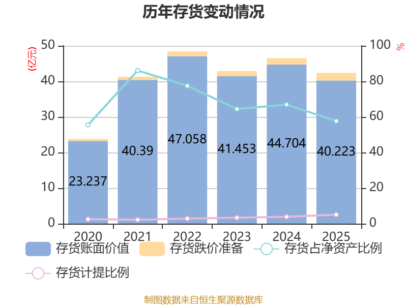 从存货变动来看,截至2025年末,公司存货账面价值为40.22亿元,占净资产的57.68%,较上年末减少4.48亿元。其中,存货跌价准备为2.14亿元,计提比例为5.06%。