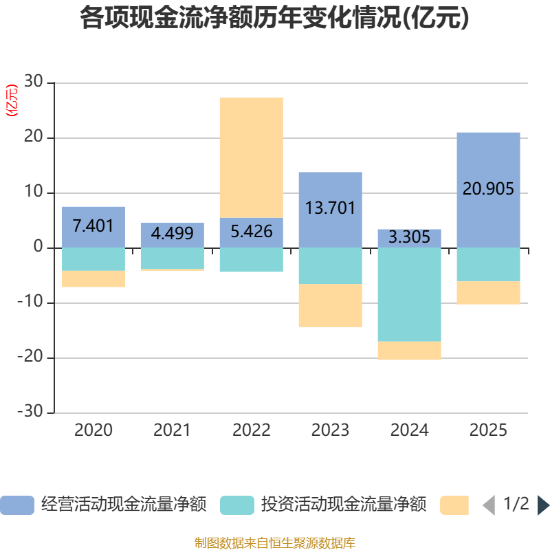 截至2025年,公司经营活动现金流净额为20.91亿元,同比增长532.55%;筹资活动现金流净额-4.19亿元,同比减少8902.63万元;投资活动现金流净额-6.15亿元,上年同期为-17.1亿元。