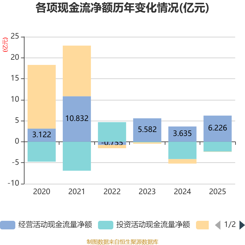 截至2025年,公司经营活动现金流净额为6.23亿元,同比增长71.3%;筹资活动现金流净额-724.79万元,同比增加9955.83万元;投资活动现金流净额-2.34亿元,上年同期为-4.13亿元。