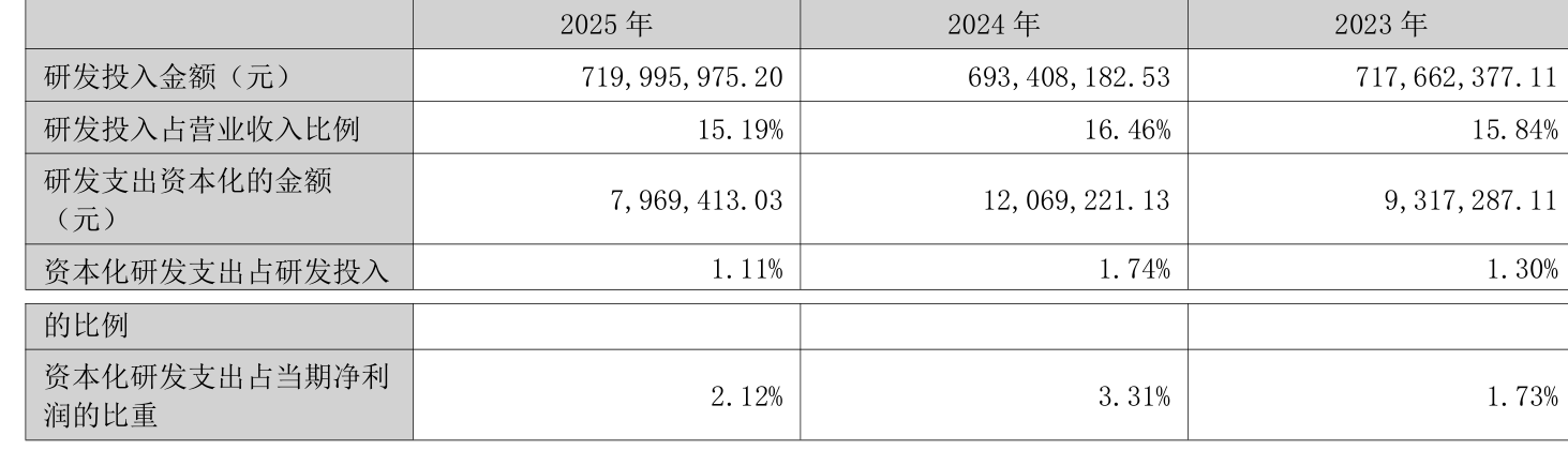 2025年全年,公司研发投入金额为7.2亿元,同比增长3.83%;研发投入占营业收入比例为15.19%,相比上年同期下降1.27个百分点。此外,公司全年研发投入资本化率为1.11%。