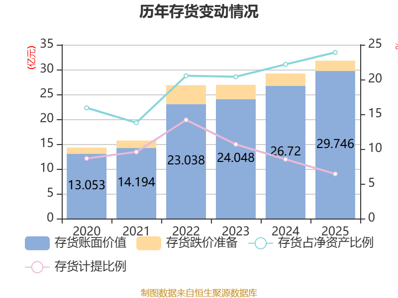从存货变动来看,截至2025年末,公司存货账面价值为29.75亿元,占净资产的23.89%,较上年末增加3.03亿元。其中,存货跌价准备为2.04亿元,计提比例为6.42%。