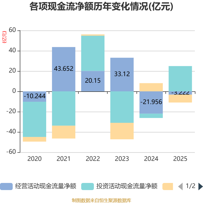 截至2025年,公司经营活动现金流净额为-3.22亿元,同比增加18.73亿元;筹资活动现金流净额-7.78亿元,同比减少15.85亿元;投资活动现金流净额24.91亿元,上年同期为-4.28亿元。