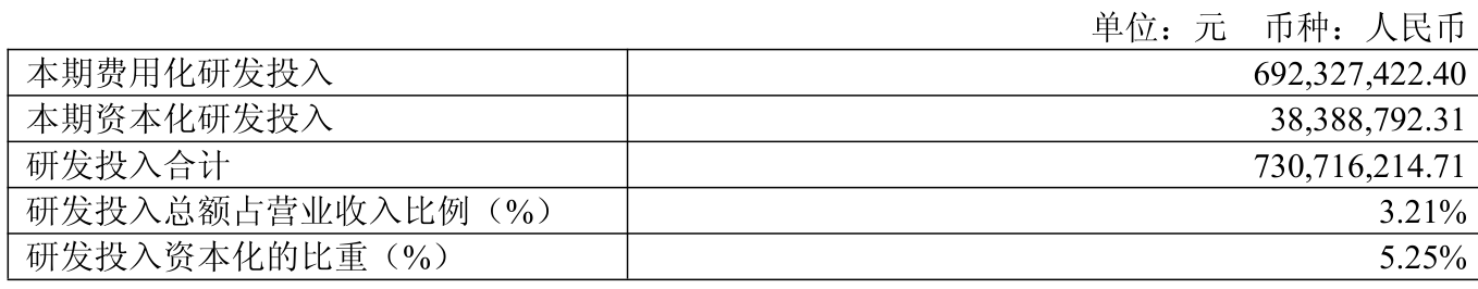 2025年全年,公司研发投入金额为7.31亿元,同比增长23.07%;研发投入占营业收入比例为3.21%,相比上年同期上升0.54个百分点。此外,公司全年研发投入资本化率为5.25%。