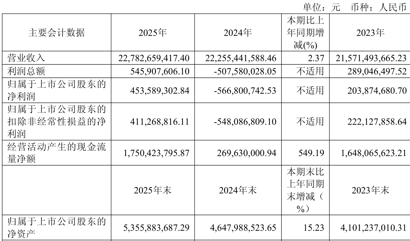 中证智能财讯继峰股份(603997)3月28日披露2025年年度报告。2025年,公司实现营业总收入227.83亿元,同比增长2.37%;归母净利润4.54亿元,同比扭亏;扣非净利润4.11亿元,同比扭亏;经营活动产生的现金流量净额为17.5亿元,同比增长549.19%;报告期内,继峰股份基本每股收益为0.36元,加权平均净资产收益率为9.10%。公司2025年度分配预案为:拟向全体股东每10股派现1.07元(含税)。