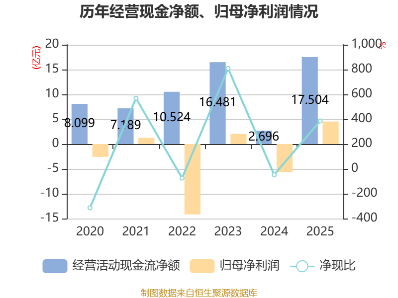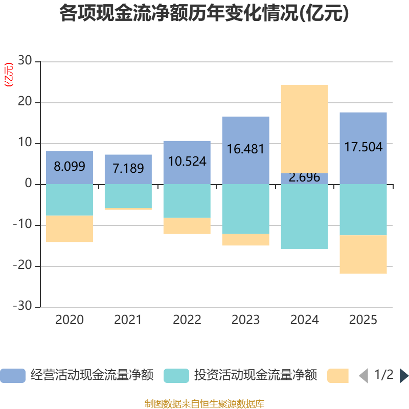 截至2025年,公司经营活动现金流净额为17.5亿元,同比增长549.19%;筹资活动现金流净额-9.39亿元,同比减少30.95亿元;投资活动现金流净额-12.53亿元,上年同期为-15.87亿元。