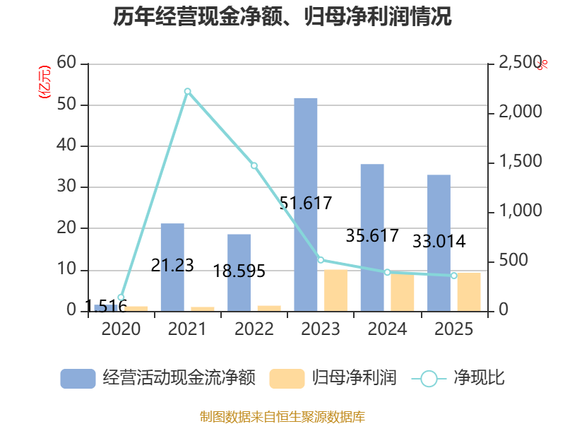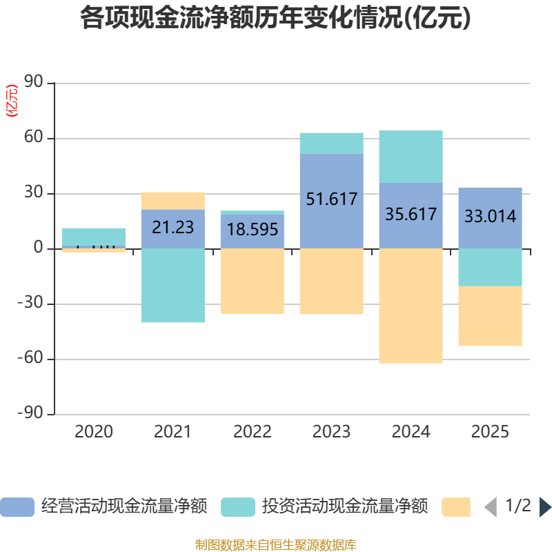截至2025年,公司经营活动现金流净额为33.01亿元,同比下降7.31%;筹资活动现金流净额-32.42亿元,同比增加30.05亿元;投资活动现金流净额-20.57亿元,上年同期为28.49亿元。