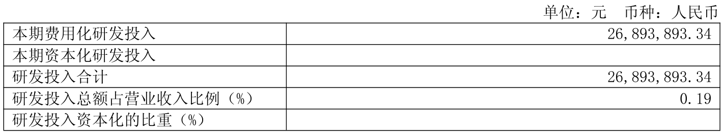 2025年全年,公司研发投入金额为2689.39万元,同比下降31.9%;研发投入占营业收入比例为0.19%,相比上年同期下降0.09个百分点。此外,公司全年研发投入资本化率为0%。