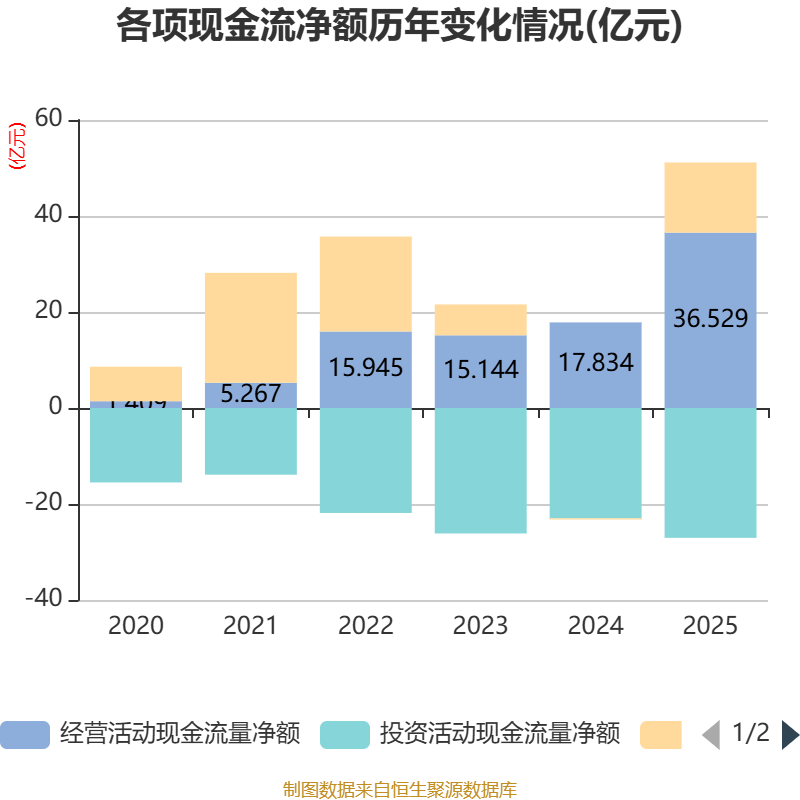 截至2025年,公司经营活动现金流净额为36.53亿元,同比增长104.83%;筹资活动现金流净额14.62亿元,同比增加14.87亿元;投资活动现金流净额-27.05亿元,上年同期为-22.99亿元。