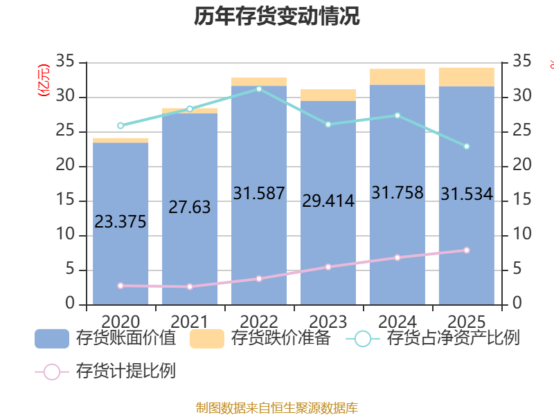 从存货变动来看,截至2025年末,公司存货账面价值为31.53亿元,占净资产的22.84%,较上年末减少2234万元。其中,存货跌价准备为2.68亿元,计提比例为7.83%。