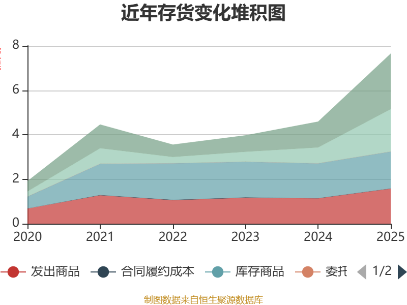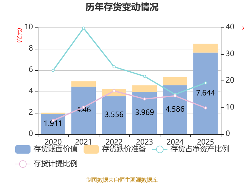 从存货变动来看,截至2025年末,公司存货账面价值为7.64亿元,占净资产的19.22%,较上年末增加3.06亿元。其中,存货跌价准备为8354.76万元,计提比例为9.85%。