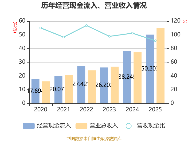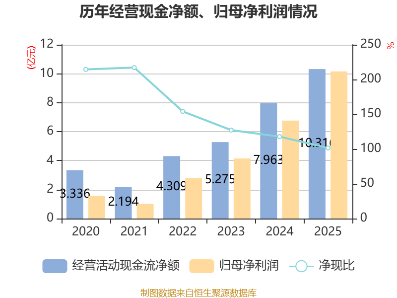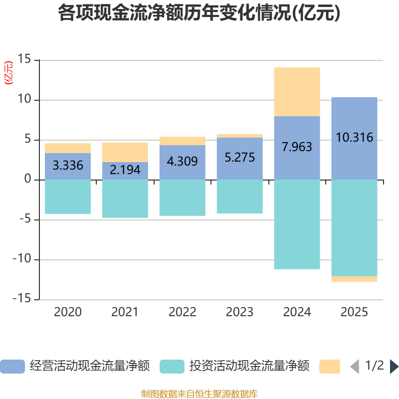 截至2025年,公司经营活动现金流净额为10.32亿元,同比增长29.55%;筹资活动现金流净额-6922.3万元,同比减少6.78亿元;投资活动现金流净额-12.12亿元,上年同期为-11.24亿元。