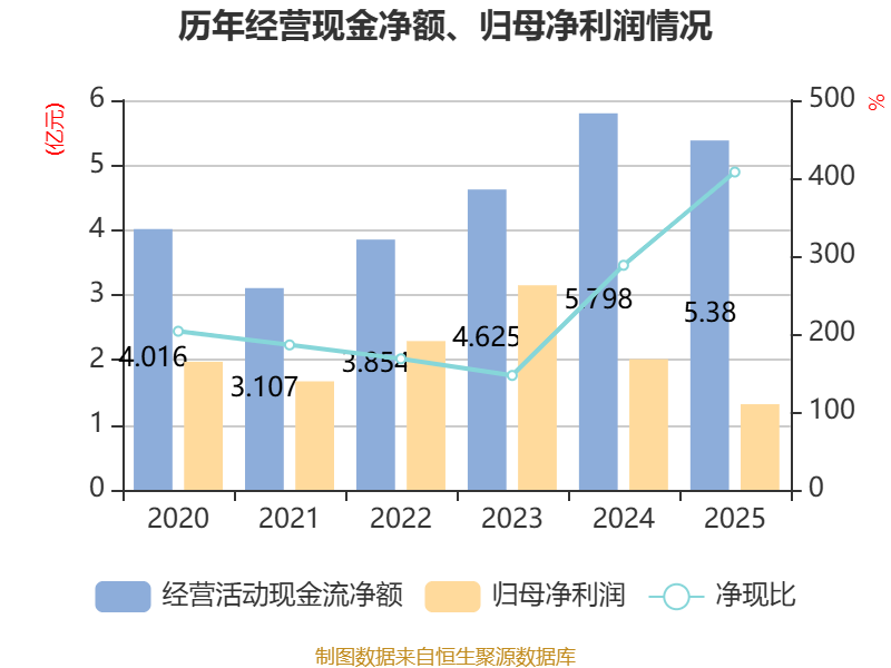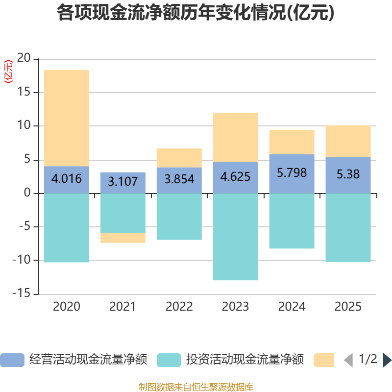 截至2025年,公司经营活动现金流净额为5.38亿元,同比下降7.21%;筹资活动现金流净额4.72亿元,同比增加1.12亿元;投资活动现金流净额-10.26亿元,上年同期为-8.24亿元。