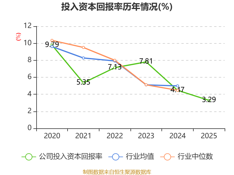 数据显示,2025年公司加权平均净资产收益率为4.26%,较上年同期下降2.16个百分点。公司2025年投入资本回报率为3.29%,较上年同期下降1.18个百分点。
