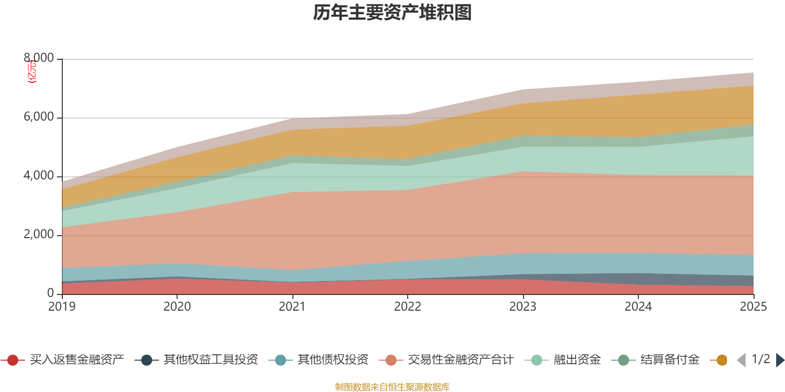 资产重大变化方面,截至2025年末,公司融出资金较上年末增加39.53%,占公司总资产比重上升4.45个百分点;货币资金较上年末减少7.99%,占公司总资产比重下降2.39个百分点;其中:客户备付金较上年末增加43.78%,占公司总资产比重上升1.26个百分点;交易性金融资产合计较上年末增加1.96%,占公司总资产比重下降0.89个百分点。