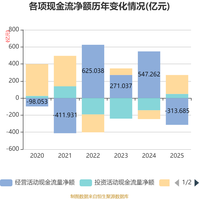 截至2025年,公司经营活动现金流净额为-313.69亿元,同比减少860.95亿元;筹资活动现金流净额221.97亿元,同比增加325.55亿元;投资活动现金流净额48.58亿元,上年同期为-142.61亿元。