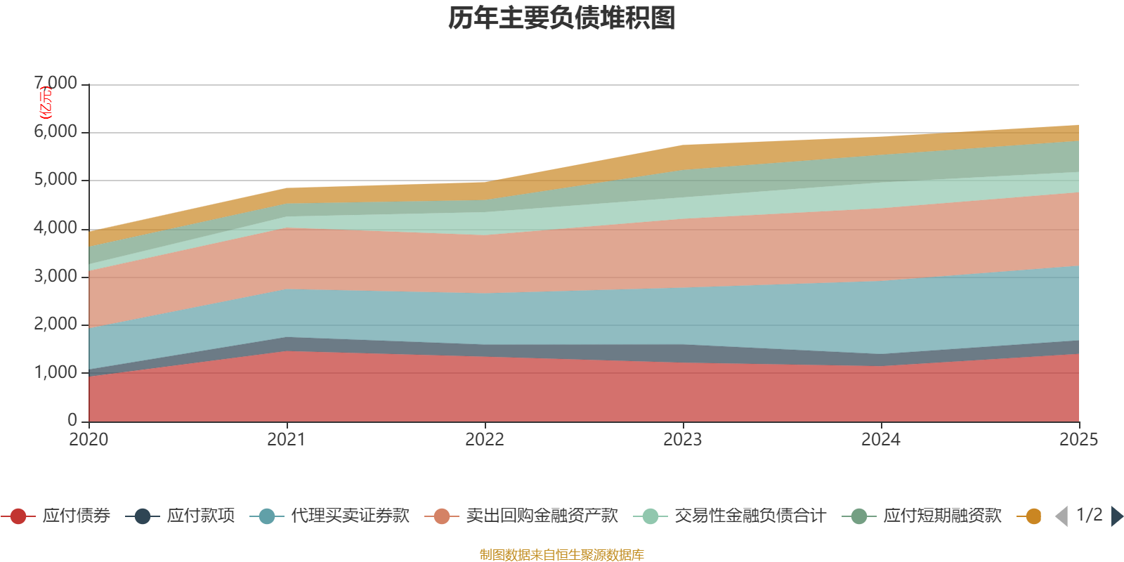 负债重大变化方面,截至2025年末,公司应付债券较上年末增加22.03%,占公司总资产比重上升2.68个百分点;交易性金融负债合计较上年末减少21.38%,占公司总资产比重下降1.84个百分点;卖出回购金融资产款较上年末增加0.96%,占公司总资产比重下降0.71个百分点;拆入资金较上年末减少40.88%,占公司总资产比重下降0.6个百分点。