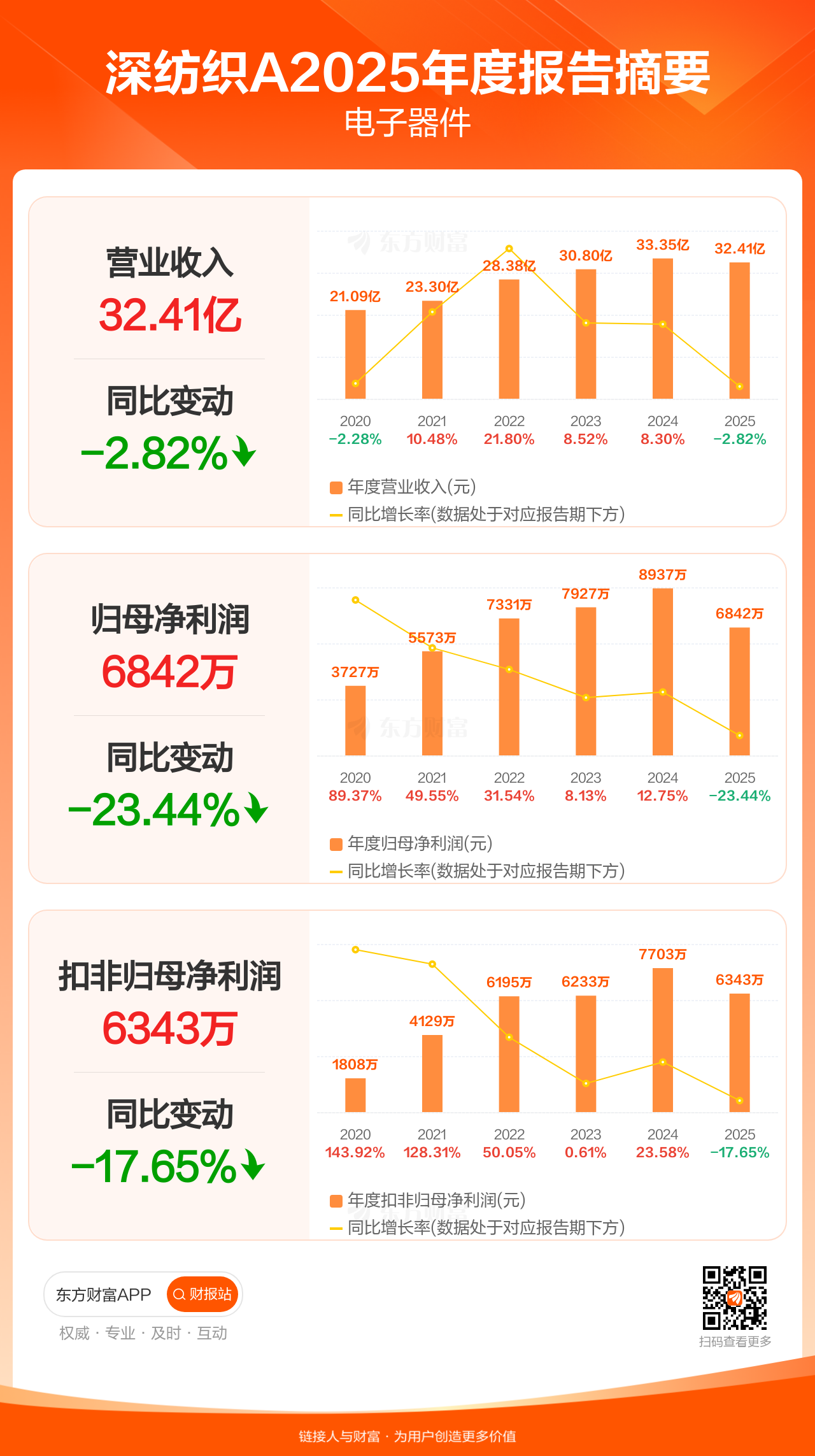 深纺织A3月30日发布2025年年报显示,公司全年实现营业收入32.41亿元,同比下滑2.82%;归母净利润6841.87万元,同比下滑23.44%;扣非归母净利润6343.40万元,同比下滑17.65%。