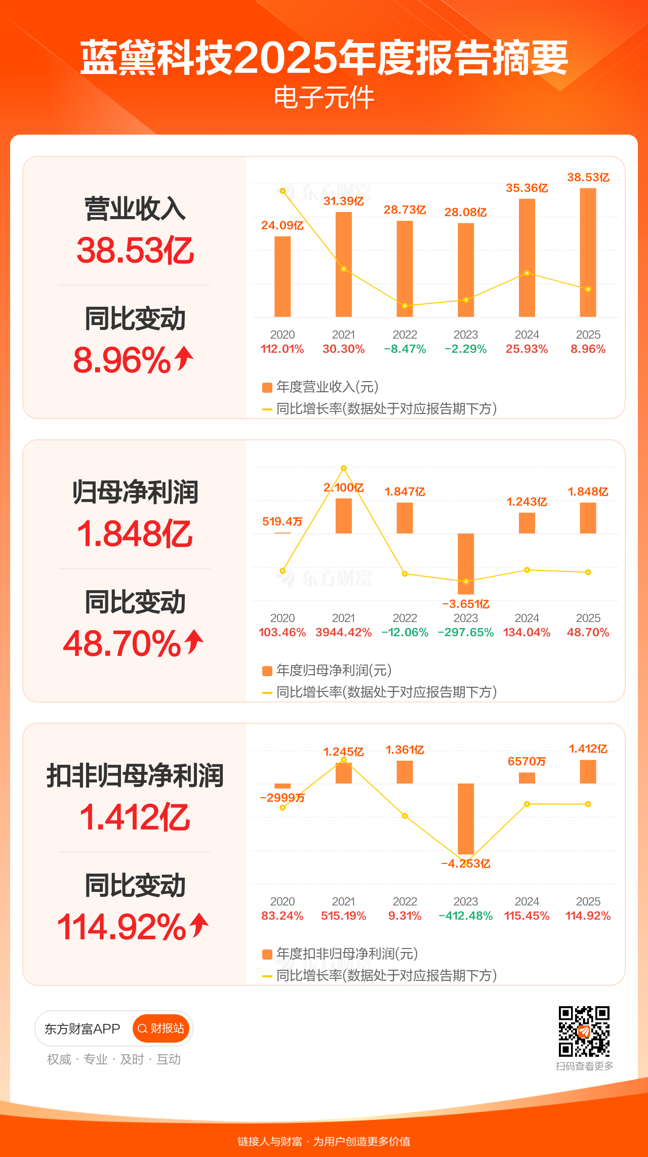 蓝黛科技3月30日发布2025年年报显示,公司全年实现营业收入38.53亿元,同比增长8.96%;归母净利润1.85亿元,同比增长48.70%;扣非归母净利润1.41亿元,同比增长114.92%。每股EPS0.28元,低于机构一致预测的0.47元。