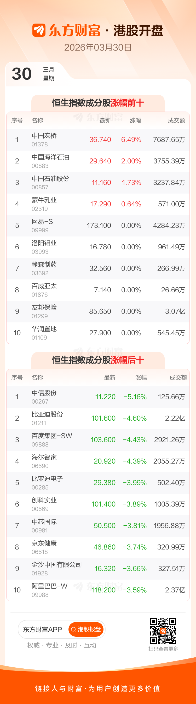 港股3月30日低开,恒生指数开盘报24532.85点,跌419.03点,跌幅1.68%;恒生科技指数开盘报4645.26点,跌132.75点,跌幅2.78%。恒生指数成分股中中国宏桥、中国海洋石油、中国石油股份涨幅居前,中信股份、比亚迪股份、百度集团-SW跌幅靠前。恒生科技指数成分股中比亚迪股份、百度集团-SW、海尔智家跌幅靠前。